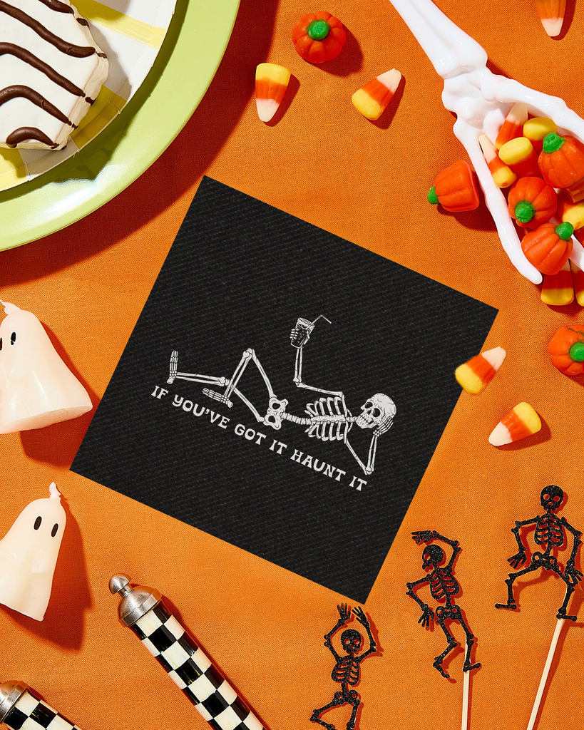 If You've Got It Haunt It Halloween Napkins! Printed in silver ink on luxe linen-like black cocktail napkins. They are a great size for cocktails, cake, appetizers or passed hors d'oeuvres. Perfect for your Halloween party!