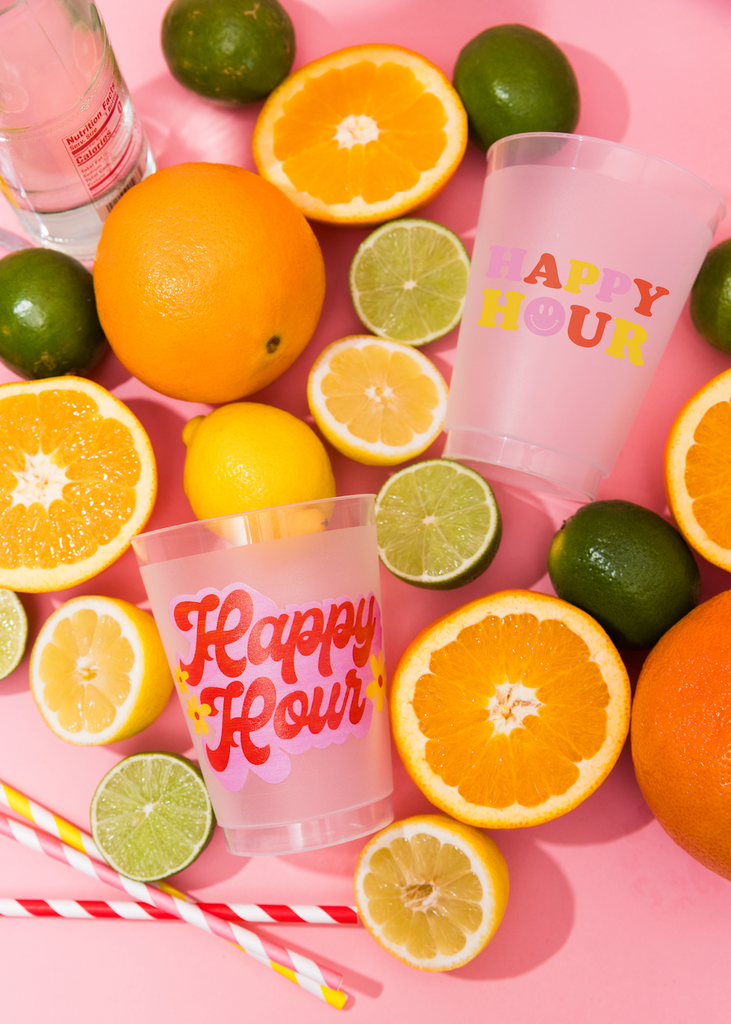 Happy Hour! Our Frost Flex cups are the perfect reusable cup for any event, gift or for every day use! Cups are frosted clear plastic with full color design. The perfect cup for your next happy hour!