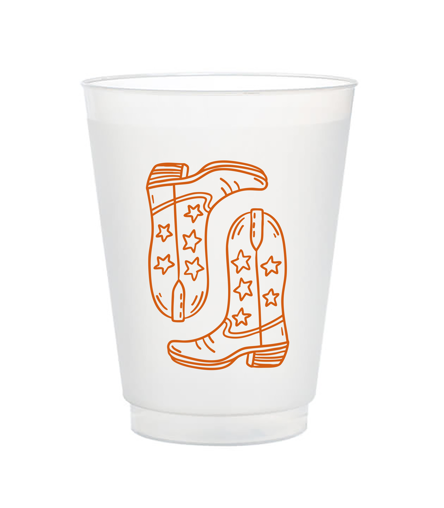 Our Frost Flex cups are the perfect reusable cup for game day, rodeo, a bachelorette party or everyday use! Cups are frosted clear plastic with burnt orange boots design.